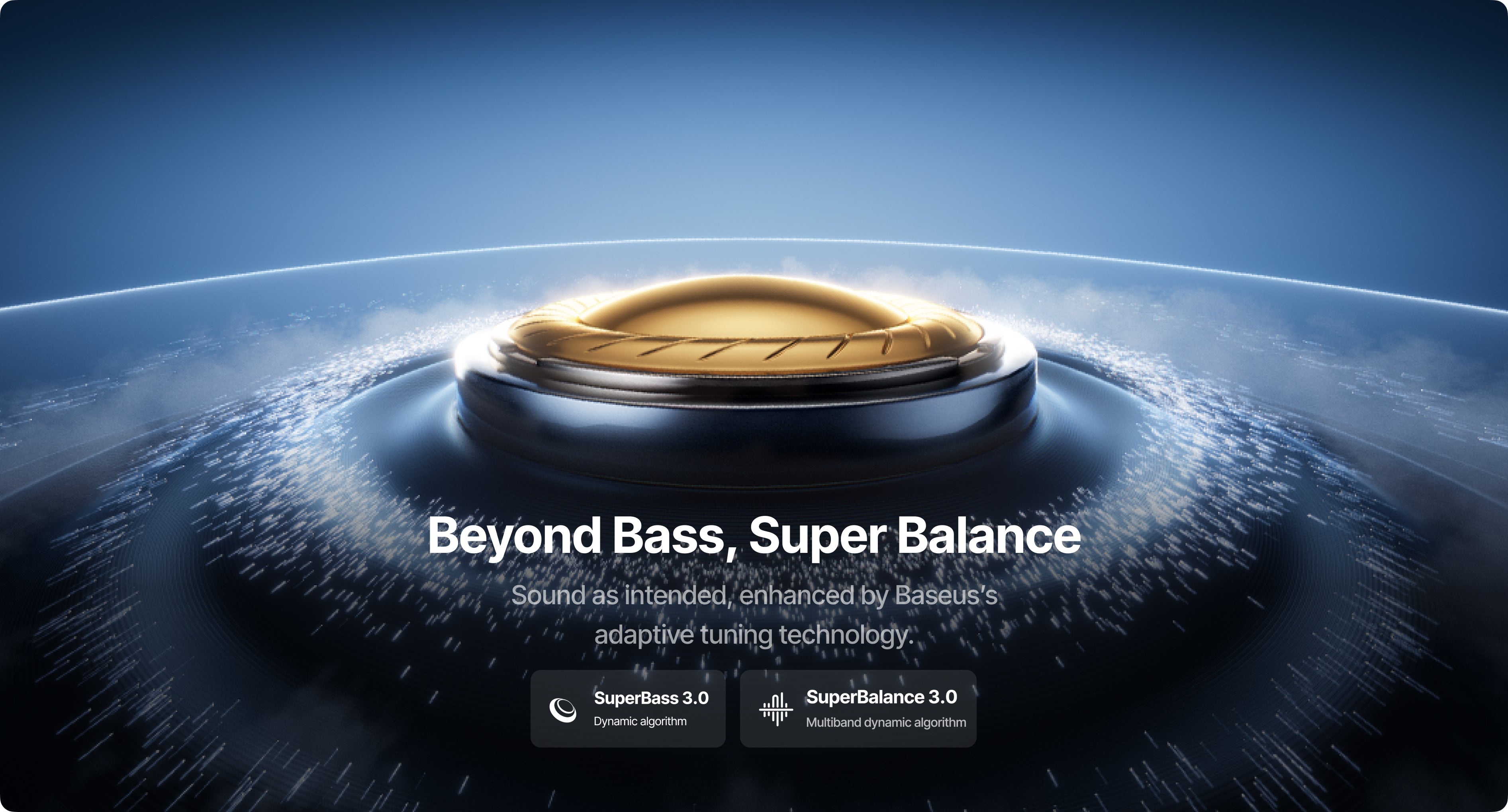 1. Tested under specific conditions in the Baseus Lab, this product achieves a measured noise reduction depth of up to -50 dB. 2. Battery playtime is based on continuous audio playback tests conducted by Baseus Lab at 50% volume with Bass Boost and Dolby Audio turned off. 3. All the data is sourced from the Baseus Lab; results may vary from actual use. 4. Dolby Audio can be activated in the Baseus App. 5. SuperBalance 3.0 is enabled by default. For even deeper sound, you can add Bass Boost in the Baseus App.